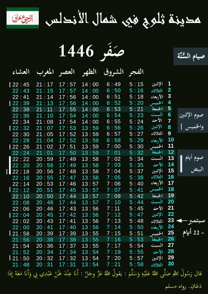 شهر صفر 1446 في مدينة ثلوج في شمال الأندلس سليم بن عبد الرحمان Salim Benabderrahmane6 أوت 20246 أوت 2024Non classé التنقل بين المواضيع السابقالتالي للتَّحميل على الهاتف الذَّكي أو للطّباعة السَّلام عليكم للتَّحميل على الهاتف الذَّكي أو للطّباعة Partager : المشاركة على X (فتح في نافذة جديدة) X شارك على فيس بوك (فتح في نافذة جديدة) فيس بوك إعجاب تحميل...