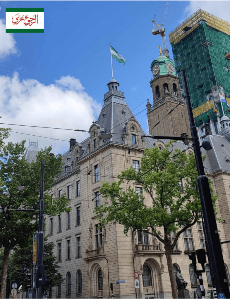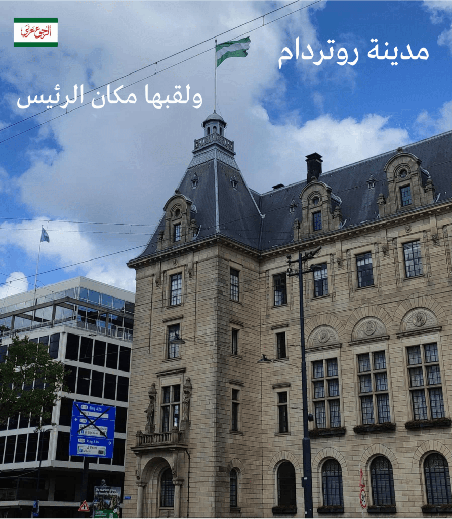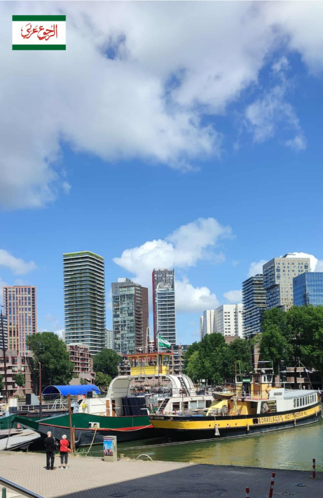 الشَّيء المهم جداً هو علم المدينة. الخضراء والبيضاء يطفو على روتردام وهذا يفرّحنا كثيرا ويفرّح كل عربي أندلسي عبر العالم. وأيضاً شيء عجيب اللَّقب المدينة هو مكان الرئيس بلغة سامية يعني الييديش وهي لغة مع نفس أصل سامي مع العربيَّة و”مكوم راإيش” بالييديش هي “مكان الرئيس” بالعربيَّة